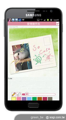 - 愛情隨手拍:將大頭貼機隨身帶著走,為每個特殊瞬間留下每一刻的美好記憶,「愛情隨手拍」有精緻細膩的使用介面,編輯步驟輕鬆上手,相本無數量限制,更擁有可供變換的8款底圖並支援 8 種顏色手繪功能,可任意調整粗細線條,將相片與圖片加上註解或圖片,再分享至 facebook 或是 email 給朋友。本服務已於 11 月台灣 Samsung Apps 限定上架。