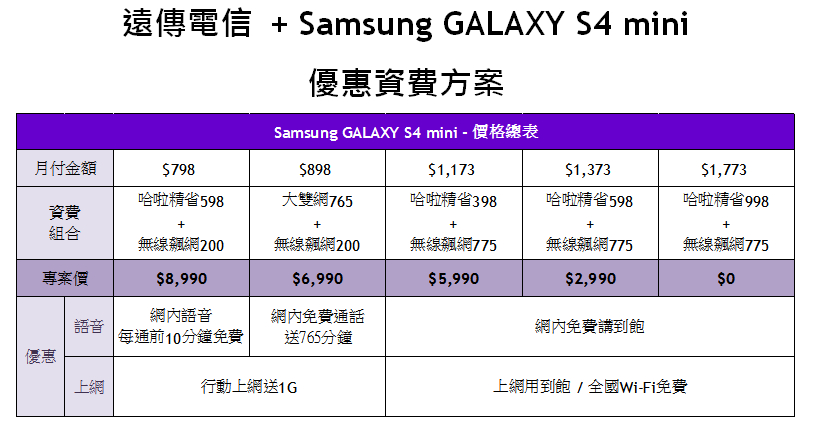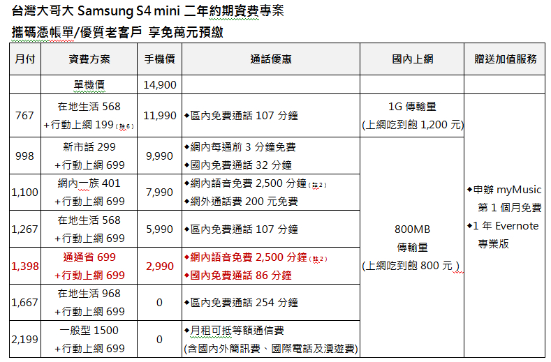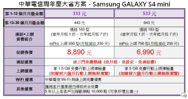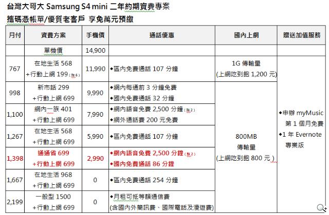 註二:Samsung GALAXY S4 mini 資費方案依各電信業者實際公告為準。