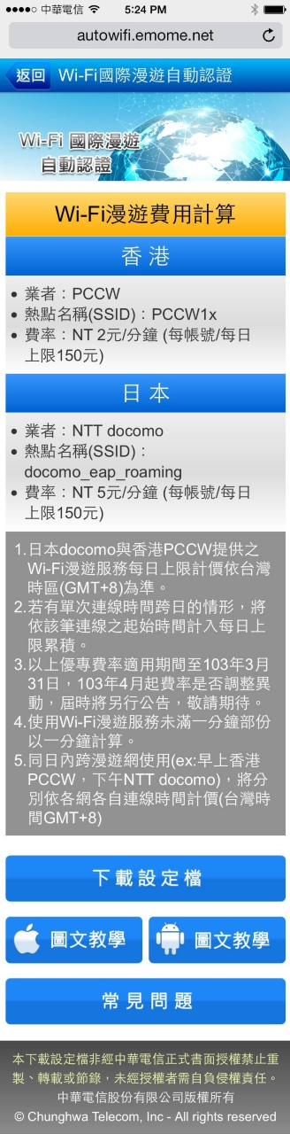 有鑑於國人赴日、港旅遊人數持續增加,中華電信針對日本與香港國際漫遊提供更多元的行動上網方案。自 102 年 12 月 6 日至 103 年 3 月 31 日,凡前往日本與香港且已申請《亞洲國際漫遊上網日租型》方案,或已關閉 《3G 國際數據漫遊》功能之中華電信 3G 客戶,都可免費申辦《Wi-Fi 漫遊自動認證》,享有「以分計費、每日 收費上限 150 元」之 Wi-Fi 漫遊上網優惠費率。