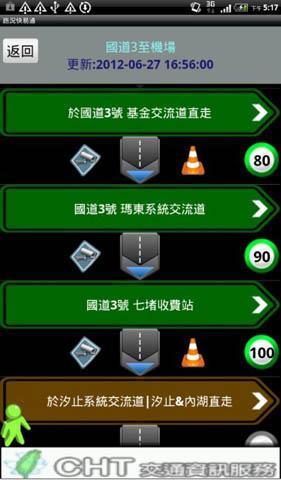 ▲「路況快易通」app提供中華電信會員常用路徑上所需交通資訊,包括時速、即時車流影像、事件通報...等。