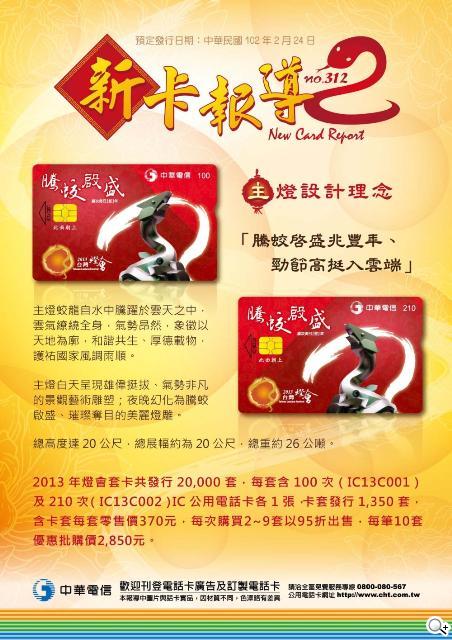 中華電信公司將自一0二年二月二十四日起,陸續在所屬各地電信營運處公話單位及服務中心發售 2013 年台灣燈會套卡,共發行 20,000 套,每套含 100 次及 210 次 IC 公用電話卡各 1 張。卡套發行 1,350 套,含卡套每套零售價 370 元,1 次購買 2~9 套以 95 折出售,每筆 10 套優惠批購價 2,850 元。上項新卡報導已在各地發售處張貼,歡迎前往觀賞,屆時更歡迎購用。