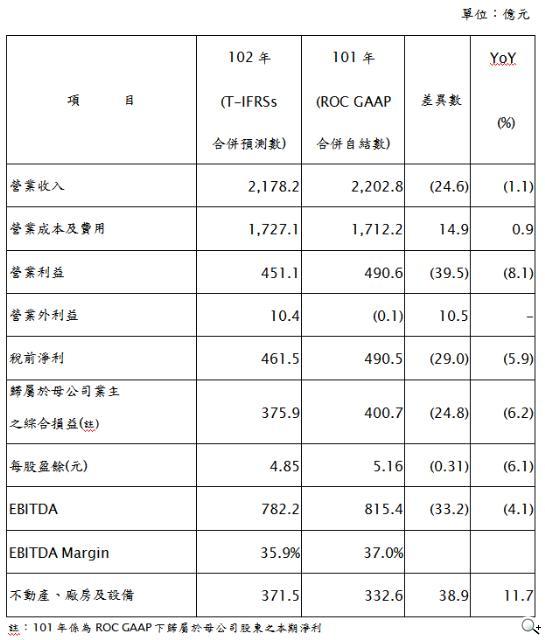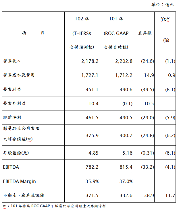 營業外利益方面較 101 年度增加 10.5 億元,主要係 101 年度認列不動產減損損失。稅前淨利預測數 461.5 億元、歸屬於母公司業主之綜合損益為 375.9 億元,較 101 年度分別減少 29.0 億元及 24.8 億元。每股盈餘預測為 4.85 元,較 101 年度自結數減少 0.31 元,約 6.1%。