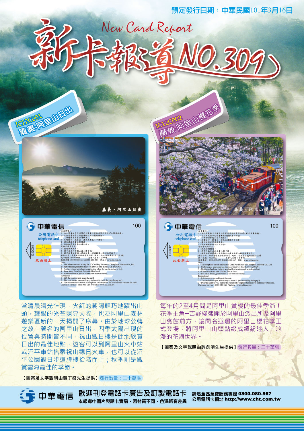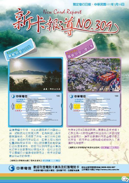 中華電信北區分公司將自一0一年三月十六日起,陸續在所屬各地電信營運處公話單位及服務中心,發售新圖案 100 次 IC 公用電話卡 2 張。2 張新卡名稱如下:一、嘉義 阿里山日出 二、嘉義 阿里山櫻花季。上項新卡報導已在各地發售處張貼,歡迎前往觀賞,屆時更歡迎購用。