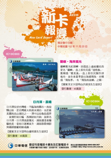 中華電信北區分公司將自一0二年十一月二十日起,陸續在所屬各地電信營運處公話單位及服務中心,發售新圖案 100 次 IC 公用電話卡 2 張。2 張新卡名稱如下:一、蘭嶼 海岸風光 二、日月潭 晨曦。上項新卡報導已在各地發售處張貼,歡迎前往觀賞,屆時更歡迎購用。