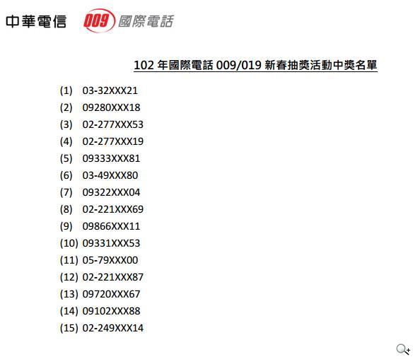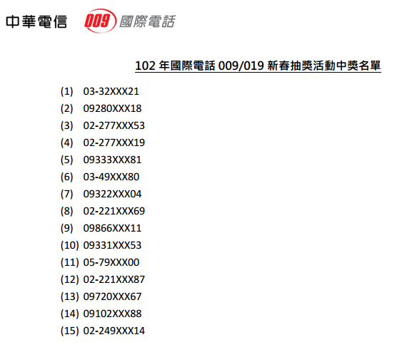 中華電信為歡慶春節並回饋撥打 009/019 國際電話的客戶,於 2/1~2/28 所舉辦的新春抽獎活動,已於 4 月 8 日順利抽出 15 位幸運中獎者!