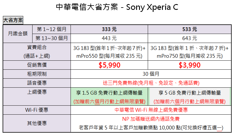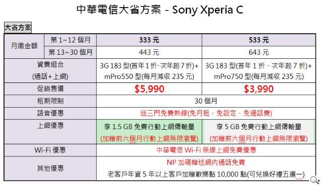 10 月 1 日起,搭配中華電信「大省方案」,月付 533 元起,SONY Xperia C 只要 3,990 元。