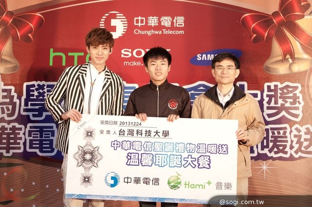 今日(24)舉辦的「集氣」頒獎典禮,年度驚喜獎的人氣校園由台灣科技大學稱冠,每位為台科大集氣者當天都獲得麥當勞百元免費餐券一份,「新世代理想美男」李唯楓更驚喜浪漫獻唱與同學一起歡樂過聖誕,集氣活動的個人獎部分則分由三位幸運得主獲得 HTC One Max、Sony Xperia Z1,以及 Samsung 的 GALAXY Note 3,是今年中華電信送出的驚喜耶誕節大禮!