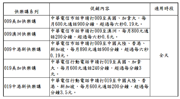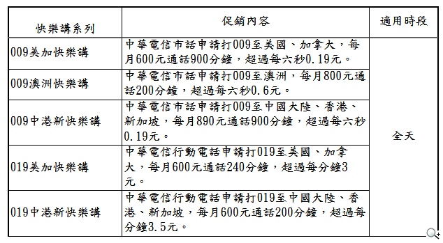 - 009 美加快樂講、009 澳洲快樂講及 009 中港新快樂講限中華電信市話個人客戶申請;019 美加快樂講及 019 中港新快樂講限中華電信行動個人客戶申請。