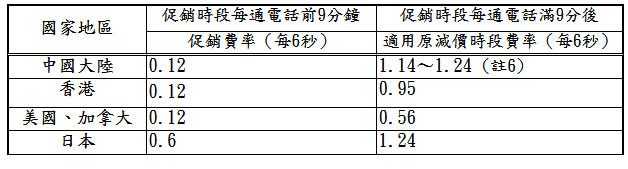 至表列中之促銷國家,前 9 分鐘可享促銷費率如下:單位:新台幣元/每 6 秒