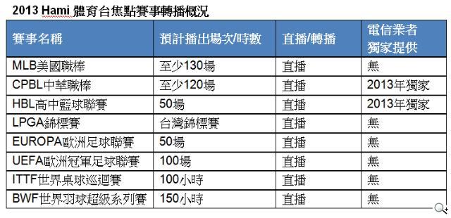 今年,Hami 體育台預計收視客戶數將達 100 萬人次,其中月租客戶更將達 3 萬人,並將持續帶來最熱血的體育賽況,包括 MLB、CPBL、高中籃球聯賽(HBL)、LPGA 台灣錦標賽等。
