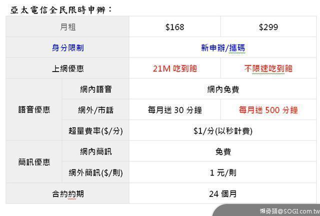 狂賀!亞太電信就是豪氣!歡慶網路門市上線功能升級,即日起至6月20日止,新申辦、攜碼,即可以NT$ 168/月享4G上網吃到飽優惠(限速21Mbps),再享網內免費、網外及市話免費30分鐘,快利用最新創舉(ORC)證件光學辨識服務,輕鬆完成門號申辦!喜歡追劇的朋友,可以考慮申辦單門號299不限速上網吃到飽方案,同樣網內免費,網外及市話再送500分鐘。這檔超級好康免預繳、免設定費,僅此一檔,錯過只能捶心肝!