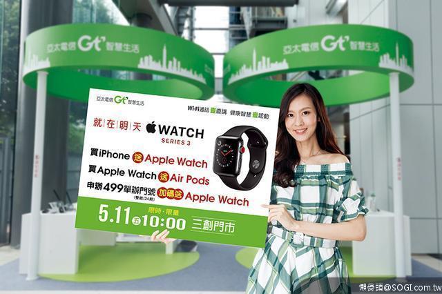 亞太電信即將正式開賣的Apple Watch Series 3(GPS + Cellular),將於5/11(五)上午10時於Gt智慧生活三創體驗門市舉行開賣活動,除日前推出的限量排隊活動外,今(5/10)日再推震撼彈,凡於開賣活動現場新申辦/攜碼/續約亞太電信「打電話+上網吃到飽」雙飽單門號24期方案的消費者,即可獲贈指定款最新Apple Watch Series 3(GPS + Cellular),限量25名,由於手錶進貨數量有限,新加碼活動所贈送之手錶,需於6月份到貨後由門市通知領取,且為嘉惠更多消費者,限量排隊優惠活動均不可重複申辦。