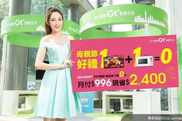 申辦亞太電信996元資費,不但可享SHARP 45吋電視(30期)專案價0元,再加碼送SHARP微波爐一台,陪媽媽在家吹冷氣追劇,還可以共享溫馨親子好食光,讓1 (電視) + 1 (微波爐) = 0 (元),超級划算!