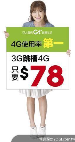 為歡慶亞太電信「4G網路可用率」領先業界,針對全國近650萬的3G用戶,亞太電信祭出3G升4G專屬超省資費,最低月付只要NT$78,即可輕鬆升級使用現在最普及的4G服務,歡迎他網3G用戶踴躍攜碼加入。