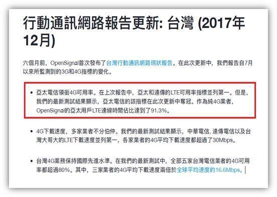 OpenSignal 2017年12月「台灣行動通訊網路現狀報告」調查(摘錄)