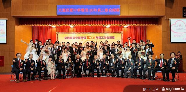 ▲交通部暨中華電信 100 年 100 對聯合結婚典禮毛部長率呂董事長與新人大合照。