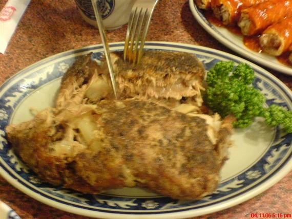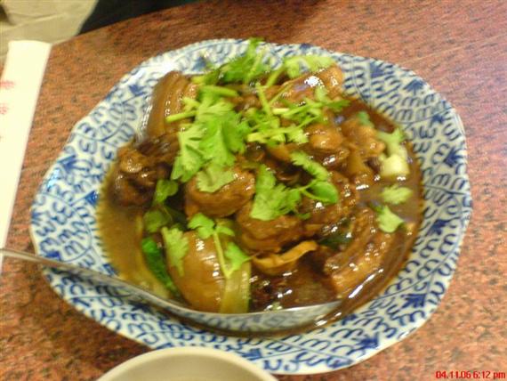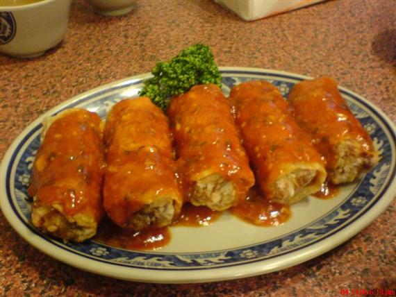 送菜上來的小姐說這是慈禧太后吃過的菜!可是在吃過後,一行人中有人說了:「啊慈禧太后吃那麼差哦!」=_=我是覺得還不錯吃,不過沒有驚喜的感覺!這道菜是雞肉裡面捲著火腿、筍子、香菇,然後外表裹粉之後下去炸,再淋上芡汁