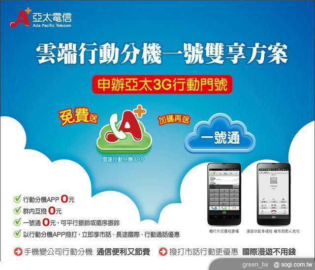 亞太電信此次回饋企業用戶所推出的「一號雙享方案」,只要在今年底前申辦亞太電信 3G 行動上網,即贈送「行動分機 APP」,同時加碼再送「一號通加值功能」,由於可以平行或是循序振鈴至市話或其他門號的行動電話,重要電話絕對不會漏接!在資費方面,以行動分機 APP 撥打網外行動電話,每分鐘只要 2.7 元起,市話則是每 3 分鐘 1.04 元起,超低的費率,絕對為您省更多,是企業用戶的最佳選擇!