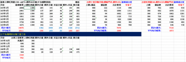 收訊可接受之後...我再幫他查遠傳前6個月帳單用excel算,台星通話不計算網內免費, 全都以網外2元推估,