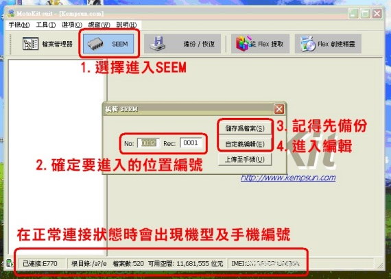 《1-1》依照下圖的順序打開編輯畫面,要注意先做好備份的動作。不管對手機做任何的修改,不要忘了這個動作,如果在手機修改後產生問題,我們才能以備份復原手機。