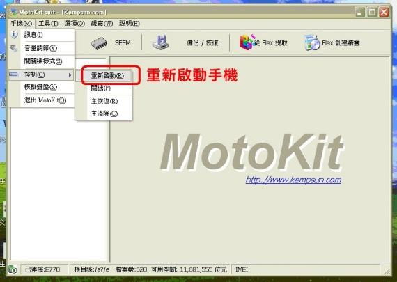 回到主視窗後,選擇功能選單裡「手機」>「控制」>「重新啟動」項目,手機會在重新啟動後以新設定儲存簡訊。