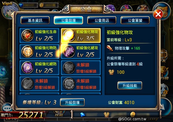 公會主要的設施包括:公會祭壇、公會商店與公會軍營。公會祭壇內設有許多公會技能,每項技能附可提升相關屬性,其包括:生命、攻擊、防禦…等,玩家可透過公會財富來升級所須的公會技能。公會商店內出售許多玩家實用的虛寶道具,其包含:強化石、技能書…等,想要提升自己戰力,但苦缺相關強化石與技能書的玩家,記得多利用公會商店這貼心的好系統喔!公會軍營內存在著公會 BOSS,玩家每日可前往挑戰一次,想額外挑戰 BOSS 領取紫裝的玩家,可別錯過!