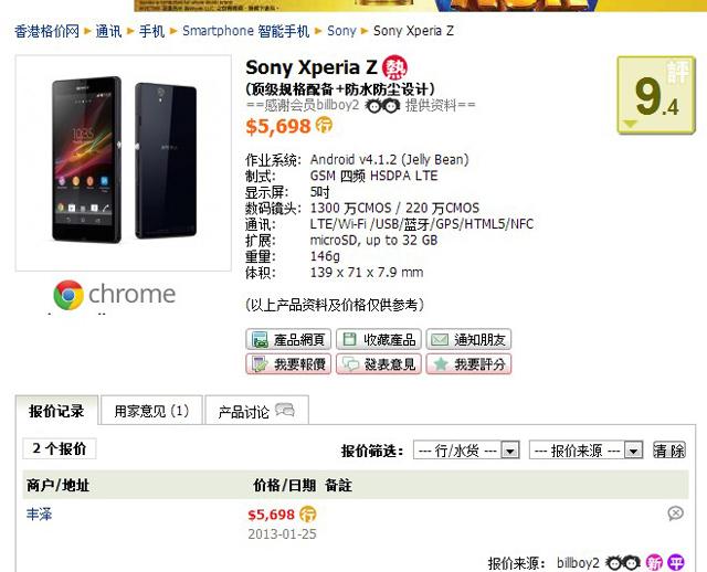 ▲不過香港 Price 網站目前還存有豐澤香港零售網站提供的 Sony Xperia Z C6603 空機售價的頁面。(圖片來源:香港 Price)