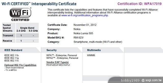 近日,新浪微博用戶爆料諾基亞將於中國再推出一款低端 WP8 入門級手機,該消息在新浪微博也得到中國電信青州分公司主管史中凱的回應,他表示該款 WP8 新機有可能為 NOKIA Lumia 505(RM-923),並公佈了該機的國際 Wi-Fi 聯盟測試 PDF 認證文檔。湊巧的是墨西哥運營商 Guerrero Móvil 隨後透過 FaceBook 發表了 NOKIA Lumia 505(RM-923)的官圖,但僅透露該機將配備 800 萬畫素相機,其他規格並未公佈。若 NOKIA Lumia 505(RM-923)如傳言定位於入門級 WP8 手機的話,該機規格應該與 NOKIA Lumia 510 相似,如搭載 4 吋觸控螢幕等。而外媒 The Next Web 更直接猜測,該機或許會棄 WP8 ,而直接採用 WP7.8 作業系統。目前該消息尚未得到官方證實,手機王將繼續補充最新相關資訊。