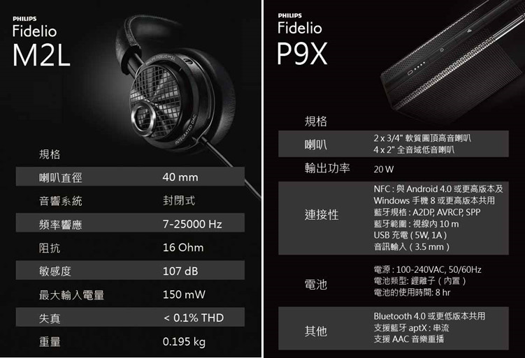 以配備獨家映射消噪技術為首的 NC1,為 Philips Fidelio 系列中全方位消噪耳機 NC1,同時採用主動及被動消噪技術,引領消噪耳機進入最高「淨」界;全新導入 LMC 設計的開放式旗艦級室內耳機 X2,上市前便因前一代機種 X1 的好評而備受注目;配備 NFC 封閉式高傳真無線藍牙耳機 M2BT,集合藍牙 4.0、aptX、AAC 等高階數位音頻格式相容於一機;全球首款封閉式 iOS Lightning 耳機 M2L,內建 DAC 打造全數位架構;時尚多彩的封閉式輕音圈行動耳機 M1MKII,具備 BRS 技術平衡低、中、高三頻表現;除此,高解析音質藍牙 4.0 隨身揚聲器 P9X,內置 8 換能器提供超敏銳聲音細節體驗,打造 Philips Fidelio 全方位的個人連網影音娛樂新「聲」代。