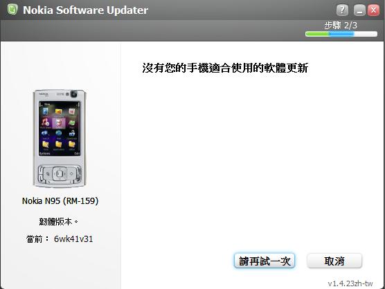小弟的台灣公司貨N95(0548450),要使用 NSU v1.4.23 zh-tw 更新至 V20.0.015 時 ,卻出現以下狀況無法升級(請見圖):