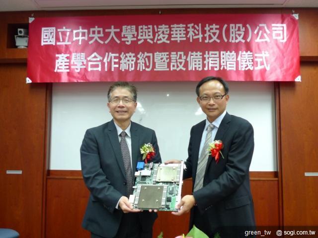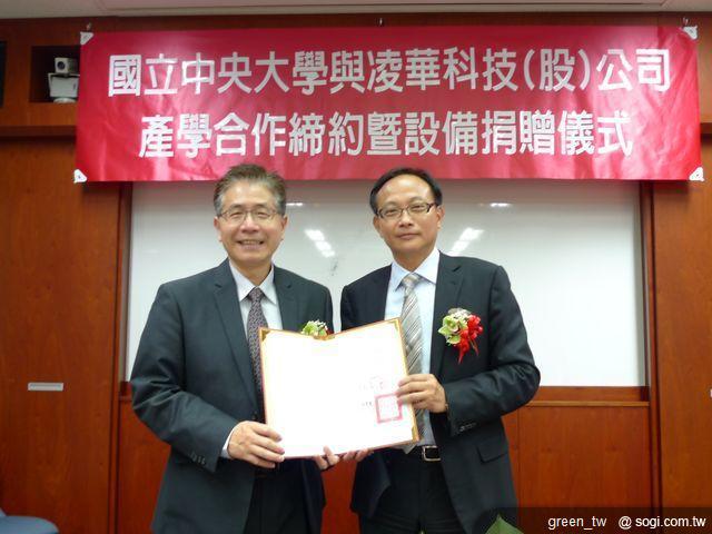 ▲凌華科技董事長劉鈞,捐贈頂級工業電腦設備與中央大學校長周景揚。