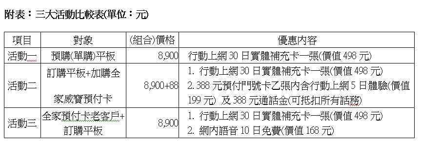 附註:全家預付卡老客戶,係指於全家便利商店申辦「威寶電信預付卡」之用戶。全家預付卡老客戶將購買的三星平板 IMEI 碼(共 15 碼)以簡訊回傳至 74755,再加贈網內語音 10 日服務密碼一組,密碼有效期為 30 天。