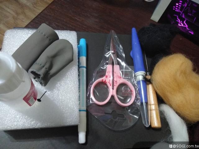 首先要準備的材料有護手套、酒精膠、眼睛一對、鼻子一顆、消失筆、剪刀、戳針、各色羊毛。