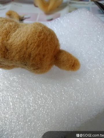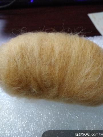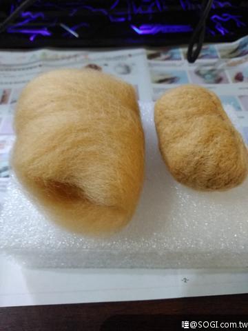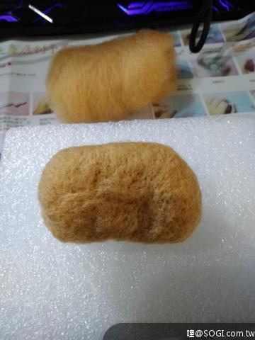接下來就是把羊毛捲成橢圓形,邊收邊捲才會好看,收好了就把它戳固定。看起來還是很柔順的樣子。