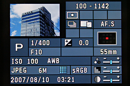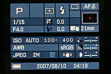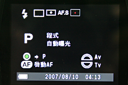 GX-10的選單真不是小編在說,密密麻麻的排列還真是有夠誇張的。雖然沿襲了Pentax的路線,不過在內容上還是有做些更動;因為小編手上沒有K10D來做比對,所以讀者們可以上DCPR Review的GX-10與K10D的比較圖,兩者之間的介面及排列上基本算是大同小異,供各位參考一下;接下來,就為介紹一些主要的選單操作內容。上方的圖片,則是在待機拍攝模式下按「INFO」鍵所顯示的內容資訊欄。