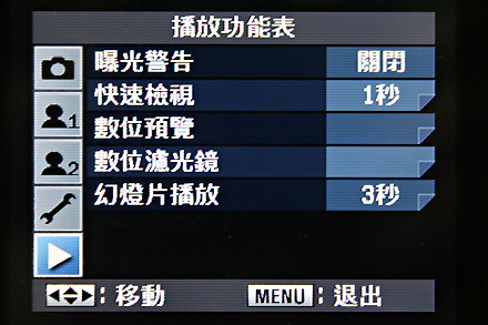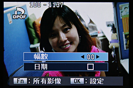 在待機拍攝狀態下,按下機背下方的『Fn’’鍵,就會出現三種不同的快捷設定;它們分別為濾鏡效果、DPOF打印輸出設定和連續瀏覽觀看設定三種。