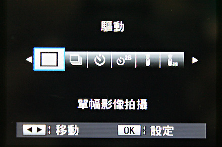 在待機拍攝狀態下,按下機背下方的『Fn’’鍵,就會出現四種不同的快捷設定;比較值得一提的,就是上方的空格選項是「驅動」設定。進入後可以依照自己的需求,進行連拍、定時和快門線拍攝等設定。