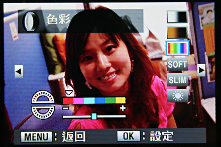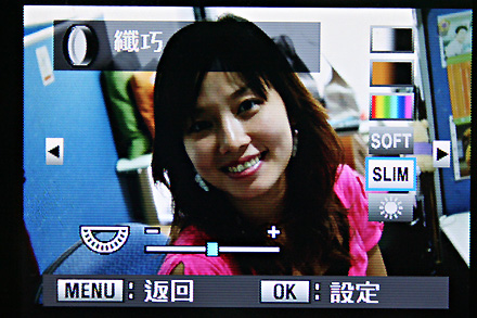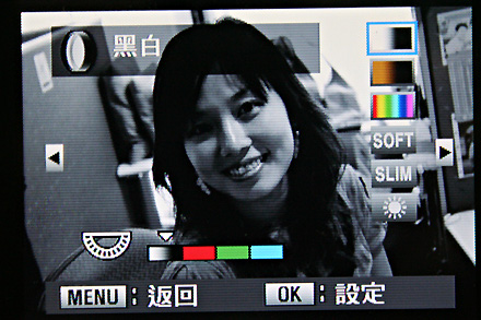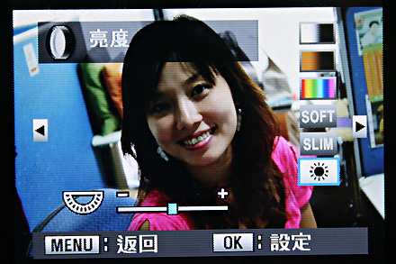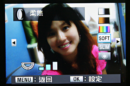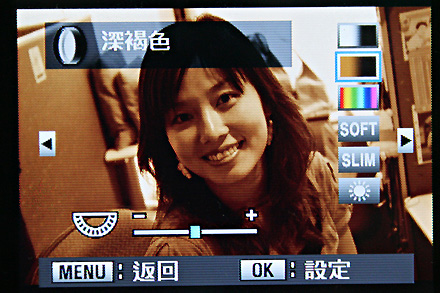 進入濾鏡設定後,可以顯示黑白、深褐色、色彩、柔焦、纖巧和亮度五種特效功能。對於不擅後製的人(我想應該很少吧~)算是個簡單方便又好用的內建功能。當中的「纖巧」其實是變形設定,使用者依自己的喜好可將畫面做拉寬拉長的變化,並非真的讓人變胖轉瘦。