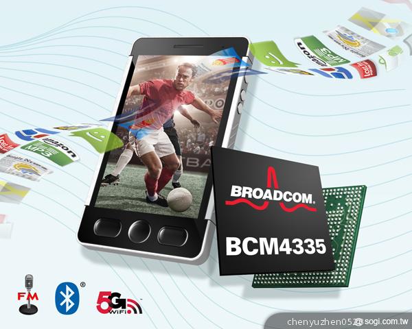 全球有線及無線通訊半導體創新方案領導廠商博通(Broadcom)(Nasdaq:BRCM)公司,針對智慧型手機、平板電腦、超輕薄筆電及其它行動裝置,推出業界第一個完整5G WiFi組合晶片BCM4335。新的解決方案不僅進一步鞏固博通無線連線領導地位,還使其成為第一家將802.11ac解決方案,試用於所有Wi-Fi不同產品類型的晶片廠商。如欲取得更多相關新聞,請造訪博通的新聞室。