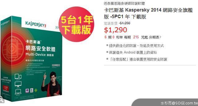 卡巴斯基 2014 網路安全軟體 Multi-Device 旗艦版產品,五台裝置一年版售價 $1,990,五台裝置三年版售價 $2,990。全系列歡喜迎馬年,馬上買就送泰騰恩隨身硬碟防護軟體 (市價 $690),創新獨家防毒、資料同步與磁碟隱形三大隨身裝置防護技術,可用於任何 USB 外接硬碟或隨身碟,隨時保護個人資料安全。
