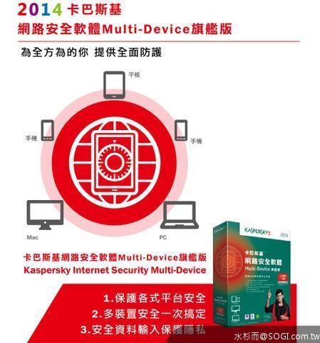 卡巴斯基 2014 網路安全軟體旗艦版為市面上唯一可安裝於 5 台不同裝置的防護軟體。全球獨家的「Safe Money 安全技術」,保護消費者網路轉帳、付費下載與線上購物的資料安全,避免誤觸釣魚網站而損失大量的金錢。2014 年創新的「ZETA 防護盾」和自動弱點入侵防護,更有效地抵禦惡意程式與未知的網路威脅。