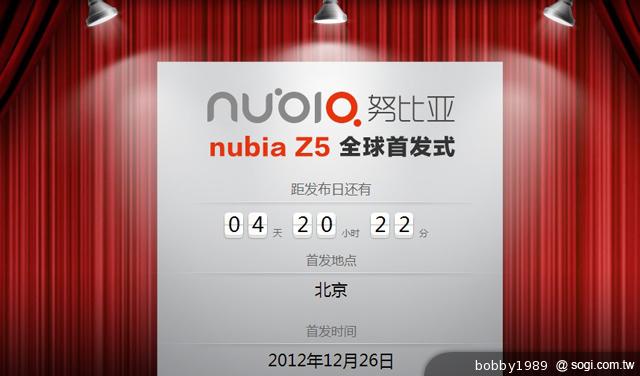 中興旗下新品牌 nubia 於 12/21 透過其新浪官方微博及官方網站宣佈,原本定於世界末日 12/21 發表的 ZTE nubia Z5 現延遲至 12/26 在中國北京正式發表。據悉,ZTE nubia Z5 將採用超窄螢幕邊框設計,搭載 5 吋、1,920 x 1,080pixels 解析度的 440ppi 觸控螢幕,採用 Android 4.1 作業系統,內建 Qualcomm S4 Pro APQ8064, 1.5GHz 四核心處理器、2GB RAM、1,300 萬畫素相機及 LED 補光燈,並內置雙揚聲器與 3,000mAh 容量的不可拆卸電池。據中關村在線於 12/21 報導指出,ZTE nubia Z5 將支援中國移動、中國聯通及中國電信三種網路制式,至於 ZTE nubia Z5 具體上市日期及售價資訊預計會在發表會當天公佈,網路盛傳該機售價可能高達 3,688 RMB(約新台幣 17,244 元)並將於 2013 年 1 月上市,若傳言屬實,其售價比近期推出的 OPPO Find 5 等手機都要貴出不少。不過,上述消息目前尚未得到官方證實,一切還得等到發表會當天分曉。