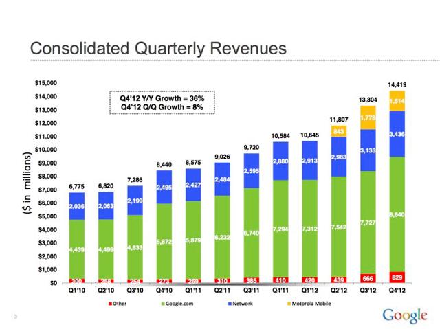 ▲2012 年第四季財報顯示,Google 總營收和淨利潤分別為 144.2 億和 28.9 億美元,總營收同比增長了 36% ,環比上升了 8%,而去年 Google 全年的收益也首度破 500 億美元。而不包括機上盒業務在內 Motorola Mobile 2012 年第四季再度虧損,整體營收為 15.14 億美元。(圖片來源:Google 官方)