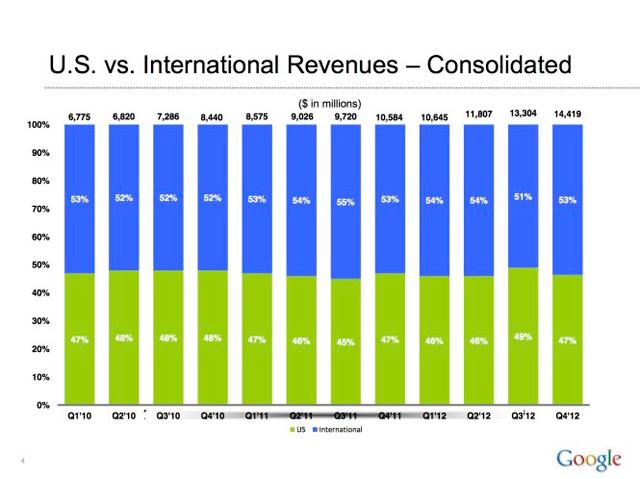 - Google 網站收入:2012 年第四季 Google 來自公司旗下網站的收入為 86.4 億美元,占 Google 營收的 67%;去年同期為 72.9 億美元,同比增長 18%。