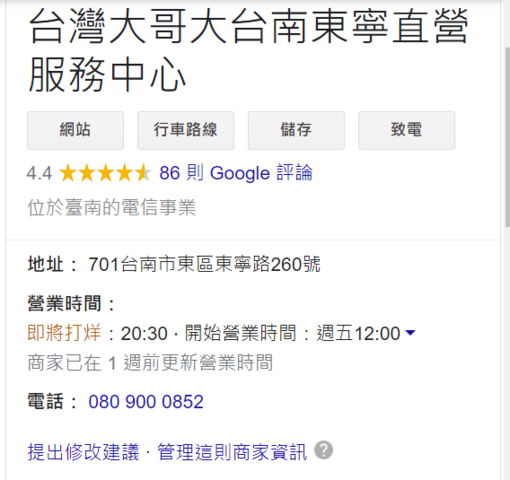 據官方網站資料是特約服務中心... 台南東寧特約服務中心 台南市東區東寧路294號 TEL:(06)236-1000 FAX:(06)236-2441 地圖 各特約服務中心營業時間: 週一 ~ 週五 10:00 ~ 21:00,週六 ~ 及例假日 10:00 ~ 19:00