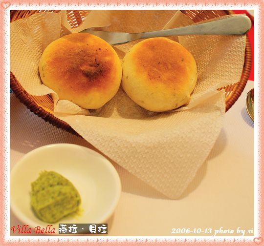 熱呼呼的麵包抹上青醬搭著吃