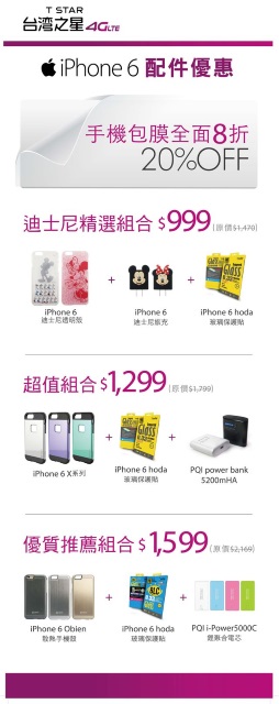 此次 iPhone 6 首賣會,台灣之星特地精心準備來自日本京都、風靡櫻花妹的 iPhone 6 獨家 3D 轉印圖案殼製作技術,只需花 10 分鐘,就可將家人、心愛寵物的照片,或特別喜愛的圖像,直接 3D 轉印成獨一無二的手機背蓋,幫心愛的最新 iPhone 6 手機穿新衣,超值優惠價只要 890 元!另外,首賣會現場還有特價 999 元、1299 元、1599 元的多樣優質配件推薦組合,最低下殺 68 折起!