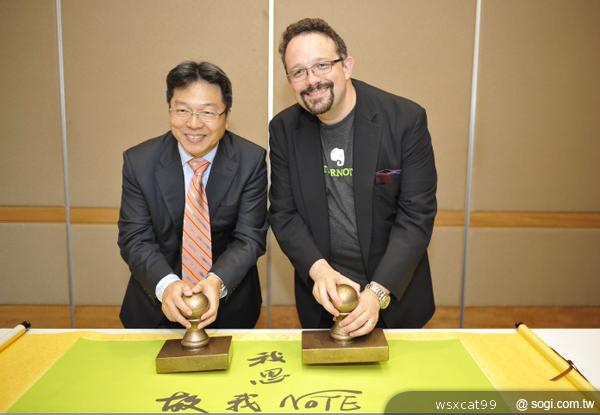 ▲台灣大哥大與EVERNOTE獨家合作記者會,台灣大營運總經理賴弦五(圖左)與EVERNOTE CEO Phil Libin以中國傳統蓋印方式,完成兩大領航企業跨國際的締結合作,也啟動雙方雲端軟體合作新頁。