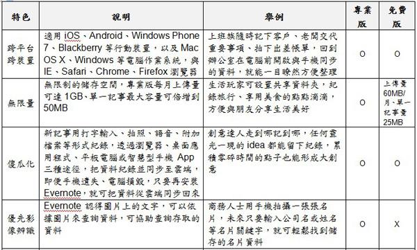 個人雲與一般雲不同,儲存的個人訊息往往包含大量圖片、影片,要求的儲存量大,因為使用者都非專業人士,不會處理複雜的資訊,所以對訊息運算力的要求不強,但對於使用介面人性化的要求非常高。台灣大哥大表示,Evernote是款人人都能使用的個人雲端服務,一開放台灣大用戶領取專業版後,勢必會讓Evernote迅速從各式各樣個人雲服務中竄起,其特色: