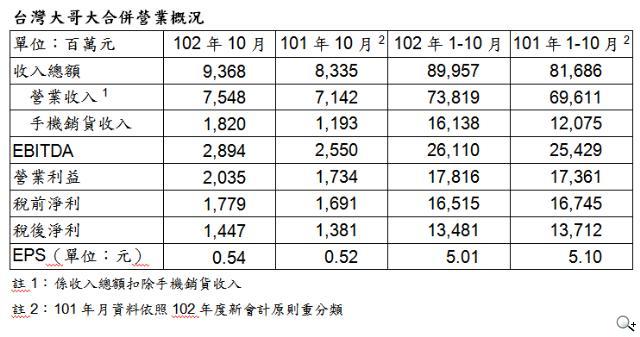台灣大哥大公佈 102 年 10 月份自結合併營收為 93.7 億元,EBITDA 為 28.9 億元,營業利益 20.3 億元,稅後淨利 14.5 億元,稅後 EPS 為 0.54 元。102 年自結前十個月合併營收 899.6 億元,EBITDA 為 261.1 億元,營業利益 178.2 億元,稅後淨利為 134.8 億元,稅後 EPS 為 5.01 元。